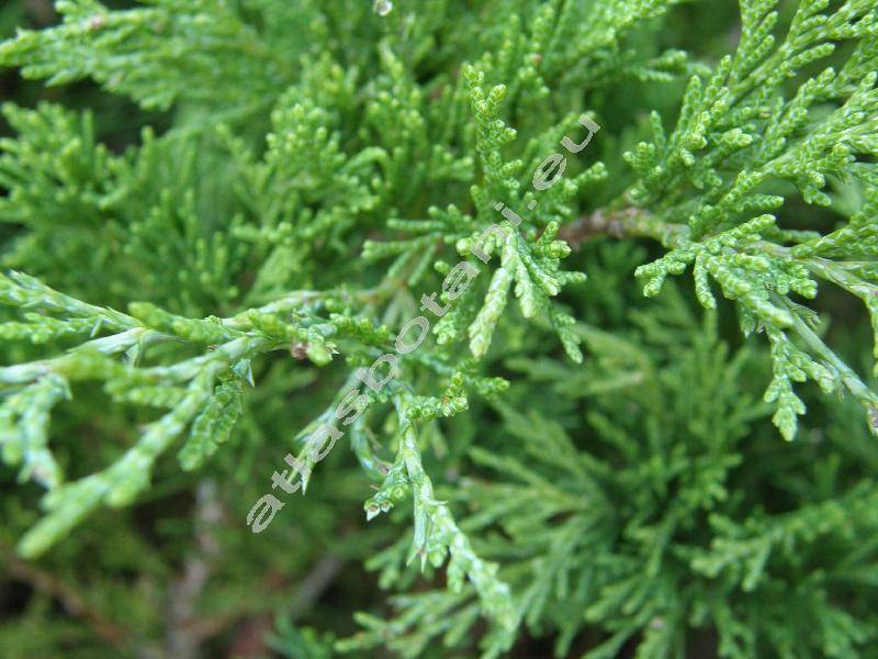 Rozložitý, stálezelený keř, vystoupavé větve dlouhé do 2 m. Koncové, tmavě zelené větvičky přímé. Mladé listy jehlicovité, dlouhé do 0,4 cm, zralé šupinovité, dlouhé do 0,1 cm. Plodem je převislá dužnatá, modrá pabobule. Dozrává prvním rokem.