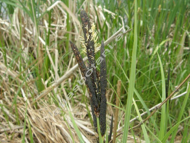 Vyšší, hustě trsnatá tráva, květní lodyhy vysoké 0,7-1,2 m, se zelenými listy. Trávové listy podélně žlábkovitě prohnuté. Kvete v květnu až v červnu. Květy samičí a samčí ve válcovitých, černožlutozelených klasech. Nažka. Mošničky zakončeny zobánkem.