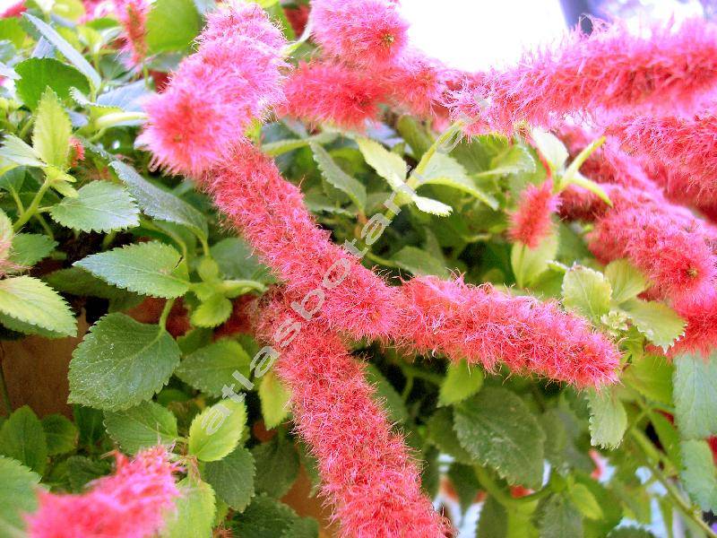Vystoupavá až převislá lodyha dlouhá 0,2-0,3 m. Zelené, řapíkaté vejčité listy, na okrajích pilovité, na vrcholku špičaté. Drobné květy kvetou v květnu až v září, v převislých červených hustých, ocáskovitých květenstvích.