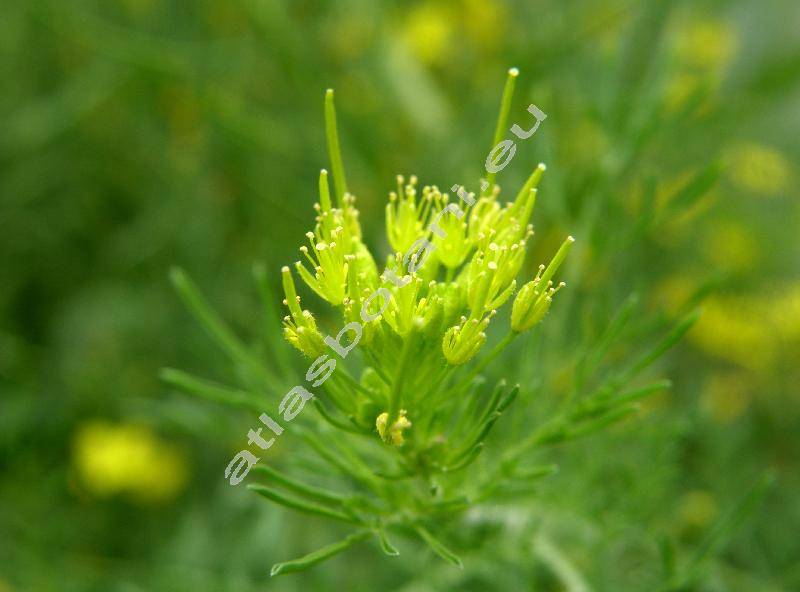Přímá, plstnatá lodyha, vysoká do 0,6-1,4 m, s rozvolněnými větvemi, se spodními řapíkatými, v obrysu vejčitými, zelenošedými listy, na okrajích peřenosečně dělenými s úkrojky. Ve středové části řapíkaté, v obrysu vejčité listy, na okrajích 3x peřenosečně dělené s čárkovitými úkrojky. Kvete v květnu až v září, květy v hroznu. Kališní lístky delší než korunní, porostlé chlupy. Světle zelenožluté květy široké do 0,5 cm, se čtyřmi kopinatými květními lístky, dlouhými do 0,3 cm, na bázi nehetnatě staženými. Šešule dlouhá do 2,5 cm, 0,1 cm široká. Semena jednořadá, světle hnědá.