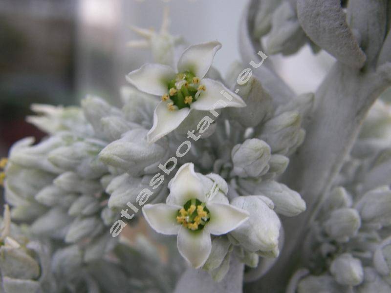 Na krátkém stonku šedozelené listy, spodní listy až fialově zbarvené, dlouhé do 10-15 cm. Celokrajné listy dužnaté, obvejčité, na bázi poloobjímavě přisedlé. Kvete v dubnu až v srpnu, na terminálním stonku, vysokém do 0,4-0,8 m, ve stažené latě. Plstnatý kalich. Nálevkovité bílé až žlutavé květy z vnější strany plstnaté, na bázi zelené, široké do 1,5 cm, dlouhé do 2 cm.