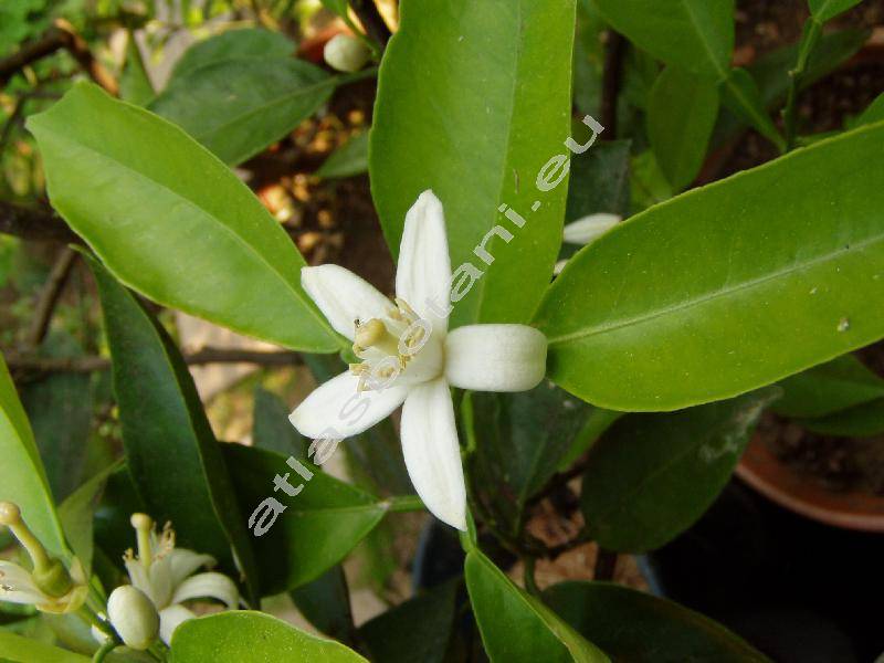 Keř nebo nižší stromek, vysoký do 6 m, s trnitými větvemi, s řapíkatými listy. Listový řapík často křídlatý. Tmavě zelené, tuhé, celokrajné, eliptické listy na bázi vejčitě nebo klínovitě stažené, na vrcholku zašpičatělé. Kvete v lednu až březnu, v našich podmínkách často do května. Velmi vonné bílé květy široké do 4,5 cm, s pěti tuhými květními lístky, dlouhými do 2,5 cm, na rubové straně narůžovělými. Dužnaté plody se žlutým oplodím, s povrchovými siličnatými nádržkami.