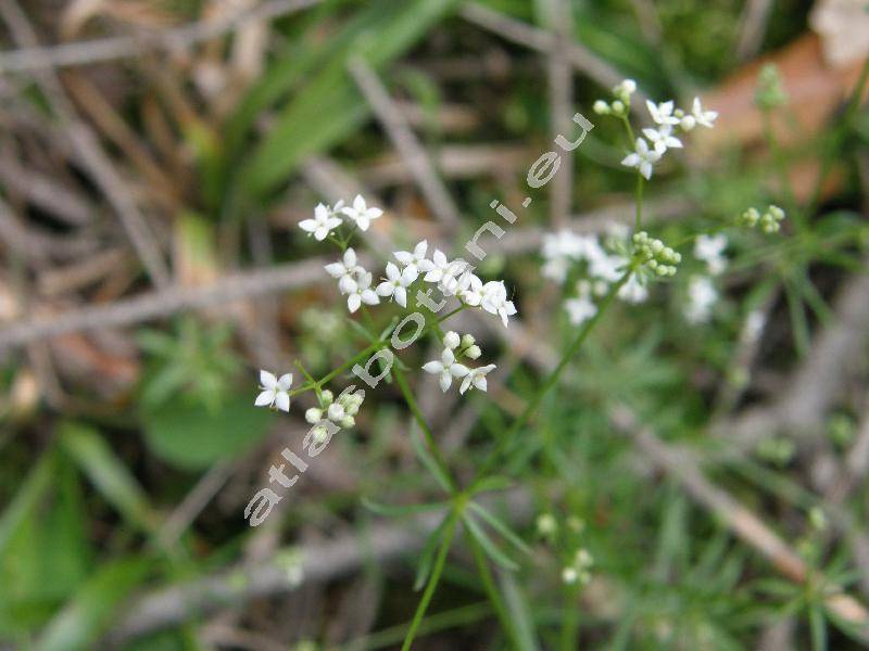 Lesklá vystoupavá lodyha dlouhá 0,3-0,9 m, s listy v přeslenech po 6-10. Čárkovité listy na okrajích podvinuté. Kvete květen až červen. Květenství řídce nahloučené. Bílé květy s lístky srostlými až do třetiny až poloviny. Čtyři korunní lístky zakončené hrotem. Dvounažka.