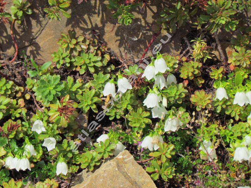 Drobná skalnička. Na poléhavém stonku drobné řapíkaté vejčité listy. Lesklé listy na okrajích se čtyřmi zuby na každé straně, na vrcholku špičaté. Kvete červen až srpen, přímá květní lodyha vysoká do 0,1 m, květy vykvétají na stonku po jednom. Bílé zvonkovité květy dlouhé 1,5-2 cm, široké do 1,5 cm, s pěti cípy.