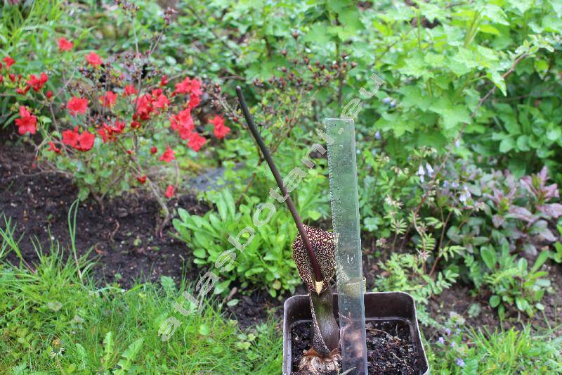 Z hlízy vyrůstá fialová palice květů, podpíraná žlutě a fialově skvrnitým toulcem, dlouhým do 20-30 cm. Kvete pouze jeden den v květnu až v červenci, květy zapáchají po hnijícím mase. Tímto pachem přilákají hmyzí opylovače. Po odkvětu začínají rašit řapíkaté zelené znožené listy dlouhé do 80 cm, s kopinatými lístky. Lístky se zpeřenou žilnatinou, na okrajích jemně zvlněné. Bobule.