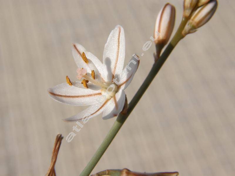 Trsnatý druh s kopinatými listy. Květní lodyhy pevné, dlouhé do 150 cm. Hvězdičkové bílé květy, široké do 2,5 cm, se šesti květními lístky se středovým hnědým pruhem, dlouhými do 1,2 cm. Plod vejčitá tobolka.