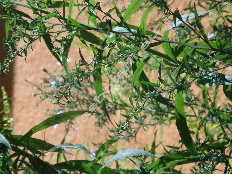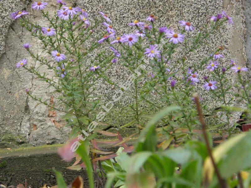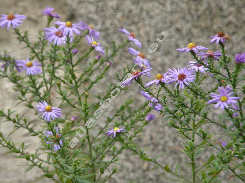 Přímý, pevný stonek, vysoký do 50 cm, se střídavými, přisedlými, kopinatými listy a hustě porostlými, tmavě zelenými, drobnými, odstávajícími listeny. Zelené celokrajné listy na bázi klínovitě stažené, přisedlé ke stonku, na vrcholku špičaté. Kvete srpen až listopad. Květní lodyha s vrcholovými květy v chocholíku. Zelený zákrov květů. Květy v úboru, širokém do 4 cm. Vnější modrofialové, také růžové nebo bílé, jazykovité květy v okrajové řadě, ligula na vrcholku se třemi zuby. Vnitřní žluté trubkovité květy na vrcholku pěticípé.
