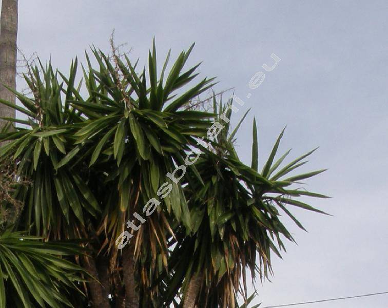 Pevný kmen stromu, vysoký přes 8 m, větvený. Na vrcholu kmene nahloučeny listy ve zdánlivé vrcholové růžici. Šedě zelené, celokrajné, tuhé, střídavé, úzce kopinaté listy, s rovnoběžnou žilnatinou, na vrcholku zašpičatělé, dlouhé přes 80 cm. Kvete v květnu až v říjnu, v latě. Zvonkovité bělavé až světle zelené květy. Tobolka.