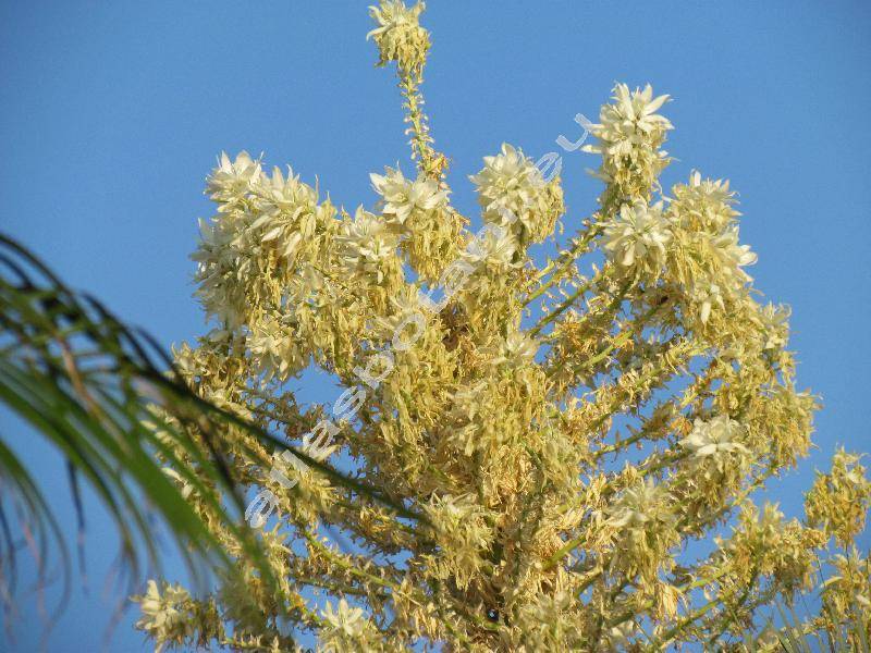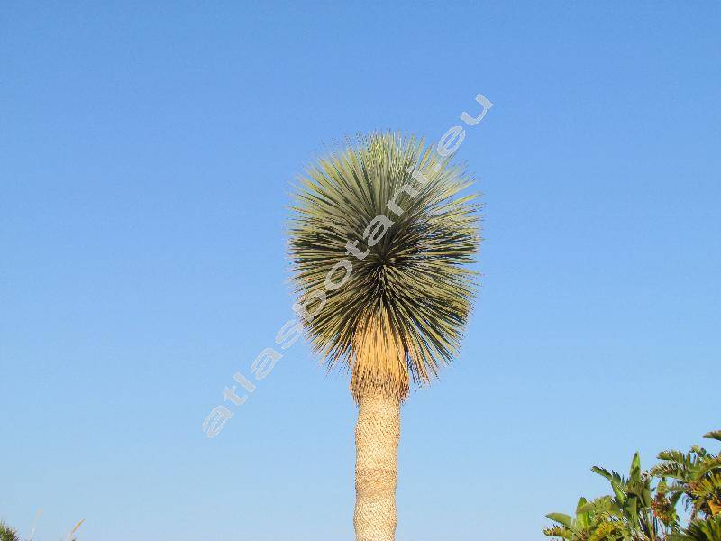 Hluboko koření. Stromovitý stonek vysoký 2,5-4,5 m, často větvený až po zničení vrcholového srdíčka. Šedozelené listy dlouhé 30-60 cm, široké do 1,5 cm. Kvete únor až červen ve vrcholové latě, jednotlivé květní větve v hroznech. Kvete v období větších srážek, většinou ne každý rok. Bílé květy se šesti lístky, dlouhými do 7 cm.