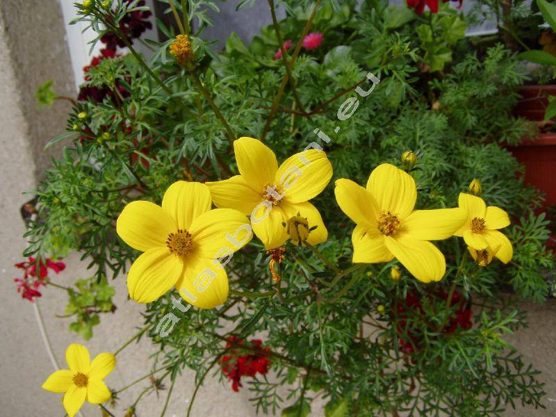 Větvená, převislá lodyha, dlouhá do 100 cm, s listy v obrysu kopinatými, na okrajích peřenosečně dělenými s kopinatými úkrojky. Květy kvetou v květnu až v říjnu. Žluté květy v úboru širokém 2 cm. Okrajové žluté květy jazykovité, ligula na vrcholku se třemi vroubky. Vnitřní pěticípé trubkovité květy terče žluté. Nažky.