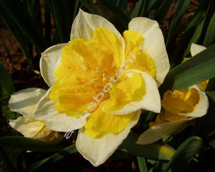 Z cibule vyrůstají úzké, šedě ojíněné, páskovité listy. Celokrajné listy na vrcholku tupě špičaté. Šedě ojíněný stvol s jedním květem, vysoký do 40 cm. Kvete v květnu. Květy široké do 7 cm, se šesti bílými okvětními lístky. Nesrostlá pakorunka s vlnitými cípy, tmavěji žlutě zbarvená. Tobolka třípouzdrá.