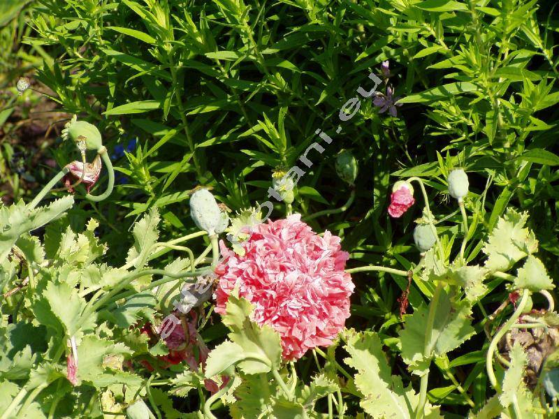 Přímá, křehká lodyha štětinatě porostlá, vysoká do 1 m. Při poranění vytéká z rány mléčná bílá šťáva. Poloobjímavé vejčité listy šedě ojíněné, se zvlněnými okraji nepravidelně zubatými. Kvete v červnu až v srpnu. Růžové, fialové, bílé květy často plnokvěté. Koruna květů široká do 7 cm. Makovice se semeny sklízíme od konce července. Tobolka s nepravými přehrádkami, s otvory pod vrcholem.
