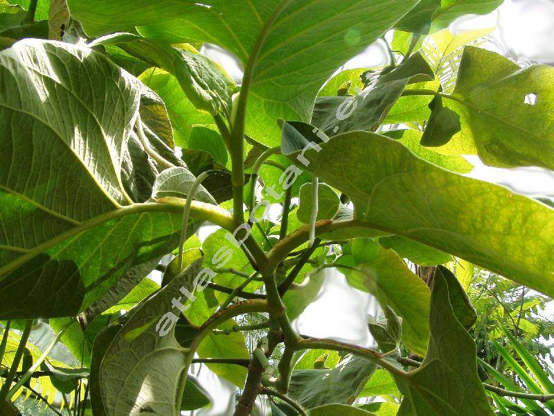 Stromek nebo větší keř vysoký do 2-5 m, s řapíkatými, sametově šedavými listy, které mají v průměru 30 cm. Listy na okrajích zvlněné, se zpeřenou žilnatinou. Bílé až zelenkavé květy v převislých klasech.