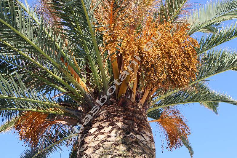 Palma vysoká 20-25 m, výjimečně až 30 m, s vrcholovou růžicí řapíkatých, šedozelených listů. Na vrcholu kmene listy dlouhé až 4 m, s kopinatými lístky. Kvete únor až červen. Květenství žlutých květů. Samičí květy drobné, laty až 70 cm dlouhé, s plody 1 m dlouhé, samčí květy v květenství do 25 cm. Plody jsou jedlé, dlouhé až 4 cm. Peckovice.