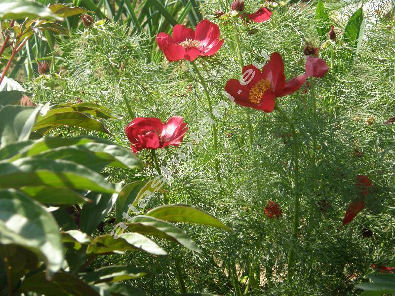 Lodyha vysoká do 60 cm, se složenými řapíkatými listy. Listy v obrysu vejčité, na okrajích peřenosečně dělené s čárkovitými úkrojky. Kvete v květnu. Červené květy s 5-8 lístky, často i plnokvěté, široké do 9 cm. Měchýřek.