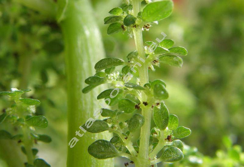 Vystoupavý, větvený stonek, vysoký do 35 cm, s velmi drobnými, dužnatými, zelenými kopisťovitými až kopinatými listy. Drobné bílé květy, široké 0,1 cm, kvetou v srpnu až v říjnu. Plody nažky s černými semeny.