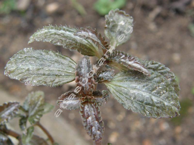 Přímý, dužnatý stonek, vysoký do 30 cm, s řapíkatými, vstřícnými listy. Dužnaté, vejčité až kopinaté listy na lícové straně se stříbřitými pruhy, porostlé odstálými chlupy, se třemi souběžnými žilkami. Květy kvetou v září až v lednu. Velmi drobné bílé až narůžovělé květy, široké 0,1-0,2 cm. Plody nažky.