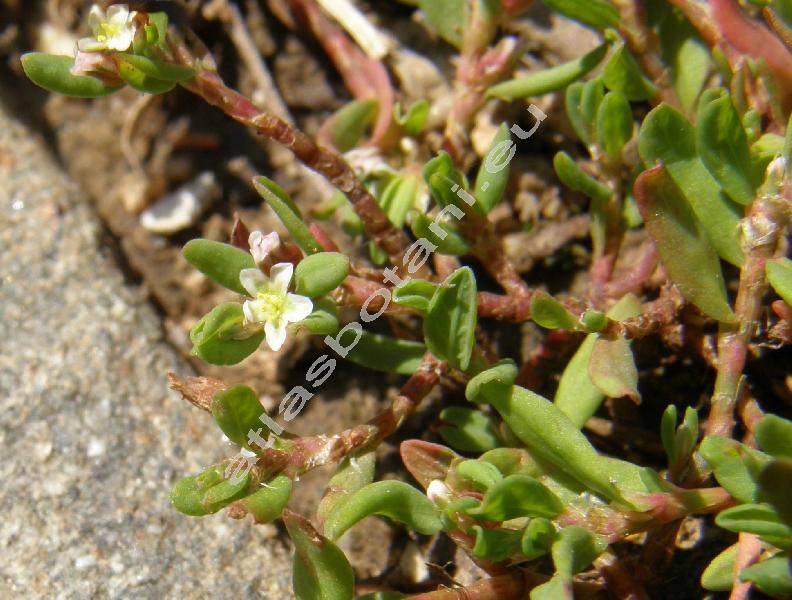 Pevný, dřevnatý, kůlový kořen. Plazivý stonek se rozrůstá do šířky, dlouhý do 30 cm. Drobné kopinaté až obvejčité listy ve stejné velikosti, krátce řapíkaté. Kvete v červnu až v říjnu. Květy po jednom až pěti v úžlabí listů. Bílý nebo narůžovělý květ na bázi zelenkavý. Nažky.
