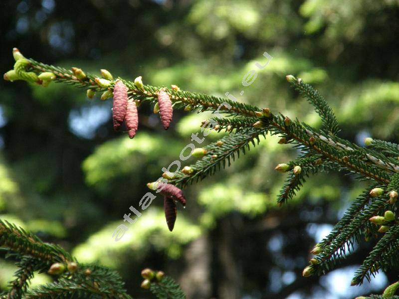 Jednodomý, neopadavý, jehličnatý strom, vysoký do 50 m. Borka u starších stromů šupinovitá, větve v přeslenu. Jehlicovité listy jsou lesklé a tmavě zelené, s jemným bílým pruhem ve středové části, mírně zakřivené, na vrcholku zaokrouhlené, dlouhé do 0,8 cm. Kvete v květnu až v červnu. Šištice v době květu vzpřímené, po odkvětu převislé. Šišky dozrávají prvním rokem, jsou dlouhé do 9 cm, nerozpadají se a některé roky zůstávají na větvi i po vypadání semen.