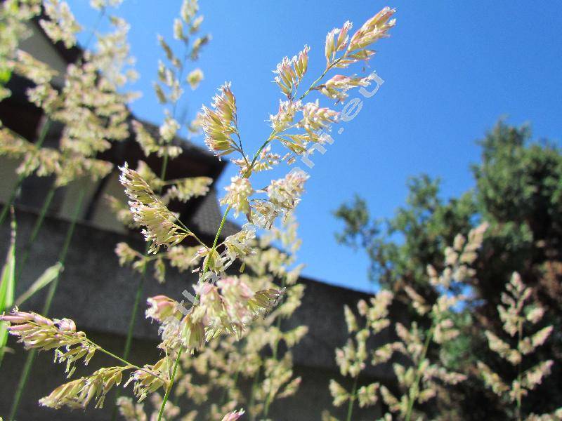 Oddenkatá tráva, vysoká 0,5-1 m, v době květu 1-2 m. Stébla s až 6 kolénky, čepele listů do 0,35 m dlouhé. Drsné listy podélně pruhované. Kvete červen až červenec v latách. Klásky jemně zbarvené do růžova. Obilka.