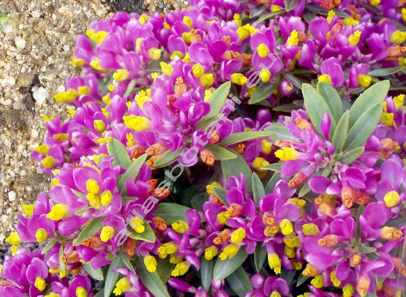 Drobný polokeř vysoký do 0,2 m, s kožovitými, leskle zelenými listy. Celokrajné kopinaté listy na vrcholku zašpičatělé. Kvete květen až červenec. Fialové kališní lístky. Žluté korunní lístky v trubce, spodní lístek vakovitý, žlutá koruna se po opylení mění na oranžovou až tmavě červenou. U základního druhu je barva lístků bílá, žlutá koruna se také mění po opylení na oranžovou až tmavě červenou. Tobolka.