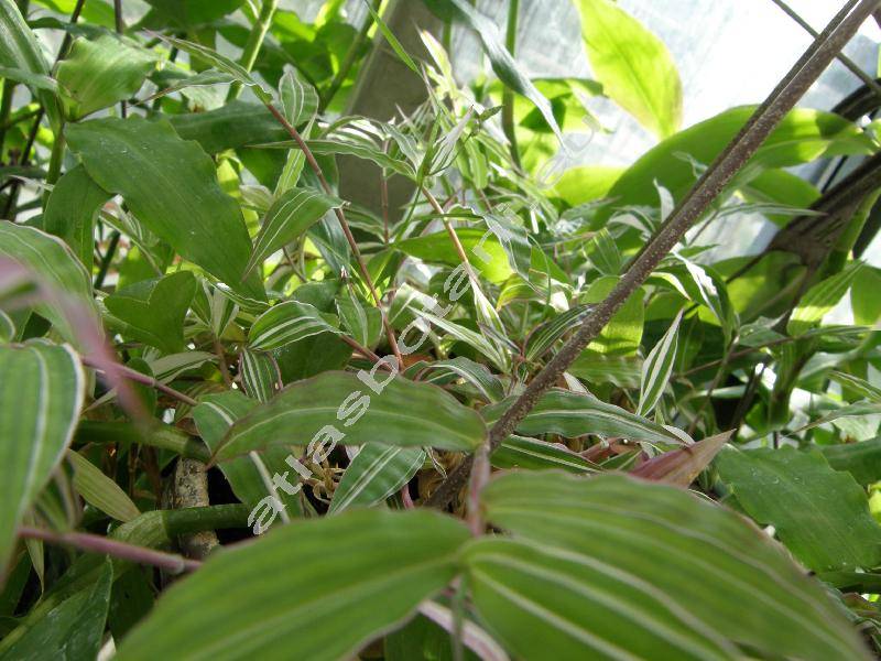 Stéblo poléhavé až vystoupavé, dlouhé do 0,5 m. Listy podlouhlé, kopinaté, zelené nebo bíle pruhované (panašování). Vzhledem podobné tradeskantiím. Kvete v kláscích.