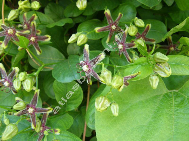 Liána. Lesklé, celokrajné, řapíkaté, eliptické, široce vejčité až srdčité listy. Kolovité květy široké do 2,5 cm, s pěti cípy, porostlé chloupky, fialově hnědé, na okrajích žlutozelené.