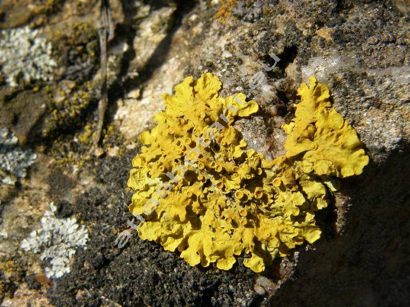 Lupenitý lišejník. Stélka růžicovitá, cca 10 cm široká. Okrajové laloky ohrnuté nahoru, často se překrývají. Na vrchní straně žlutý až oranžový. Spodní strana světlá s vláskovitými hrizoidy, které prorůstají do podkladu. Miskovité plodničky na lícové straně. Výtrusy.