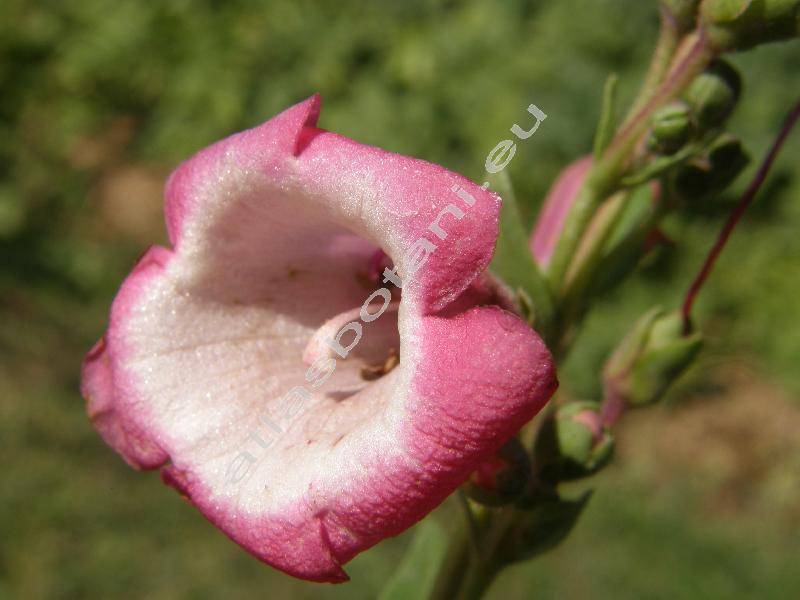 Přímá lodyha, vysoká do 0,5 m. Přisedlé vejčité až kopinaté listy zelené, na okrajích jemně pilovité nebo celokrajné. Kvete v červnu až v září. Růžové květy široké do 4 cm, dlouhé do 5 cm. Žláznatá, nálevkovitá, dvoupyská korunní trubka s nestejnými bílými cípy. Tobolka.