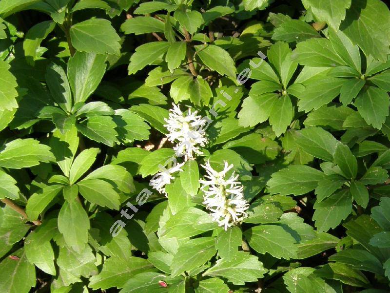 Stálezelená rostlina vysoká do 0,3 m. Přímá lodyha na bázi dřevnatí. Tmavě zelené, lesklé, tuhé listy kopisťovité až obvejčité, na bázi klínovitě stažené, směrem k vrcholu s odstálými pilovitými zuby. Listy na vrcholku mírně nazpět stočené. Vyšlechtěny i listy panašované, se žlutými až bílými skvrnami. Kvete únor až červen ve vrcholových klasech bílých květů bez květních lístků, kalichů s výraznými bílými tyčinkami.